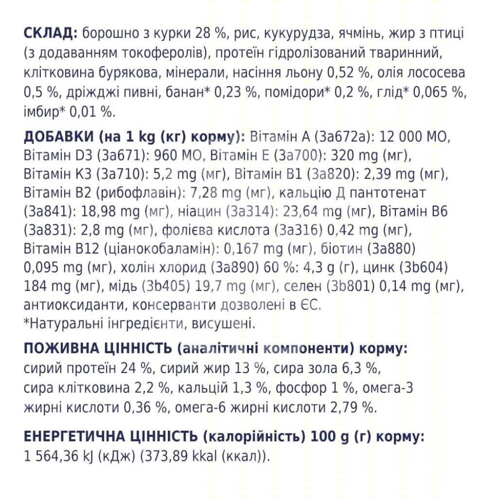 24/13 – збалансована формула для щоденного годування Для дорослих собак віком від 1 року М’ясні інгредієнти на першому місці у складі Оптимальна гранула для собак середніх порід Суміш токоферолів як натуральний антиоксидант Вітаміни D3, E,B1,B5, мікроелементи та амінокислоти Омега 3 + Омега 6 для здорової шкіри та блискучої шерсті Формула ІNTEGRAMIX: сушені томати, імбир, глід та банани – для загального здоров’я улюбленця Без штучних ароматизаторів та барвників